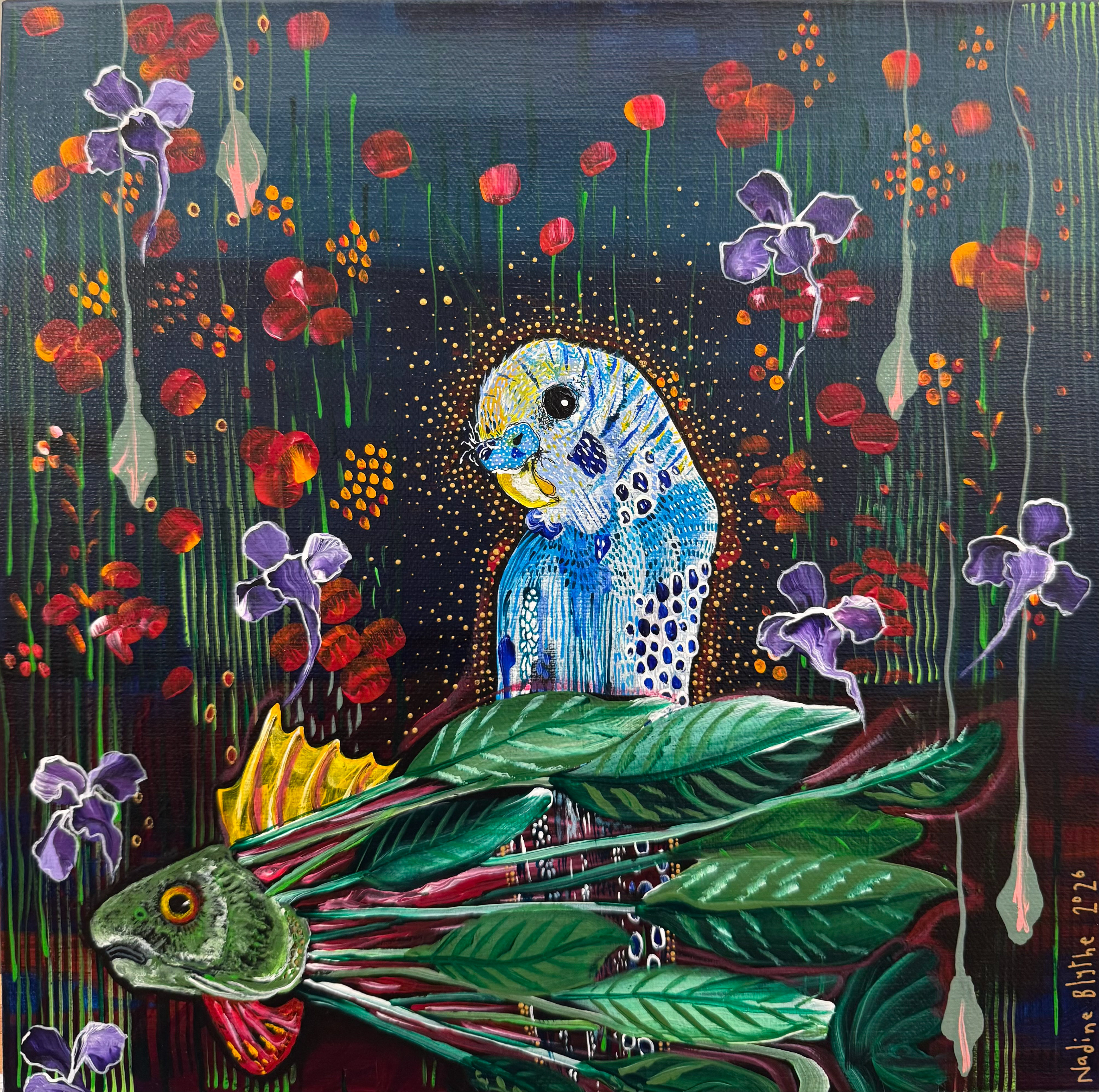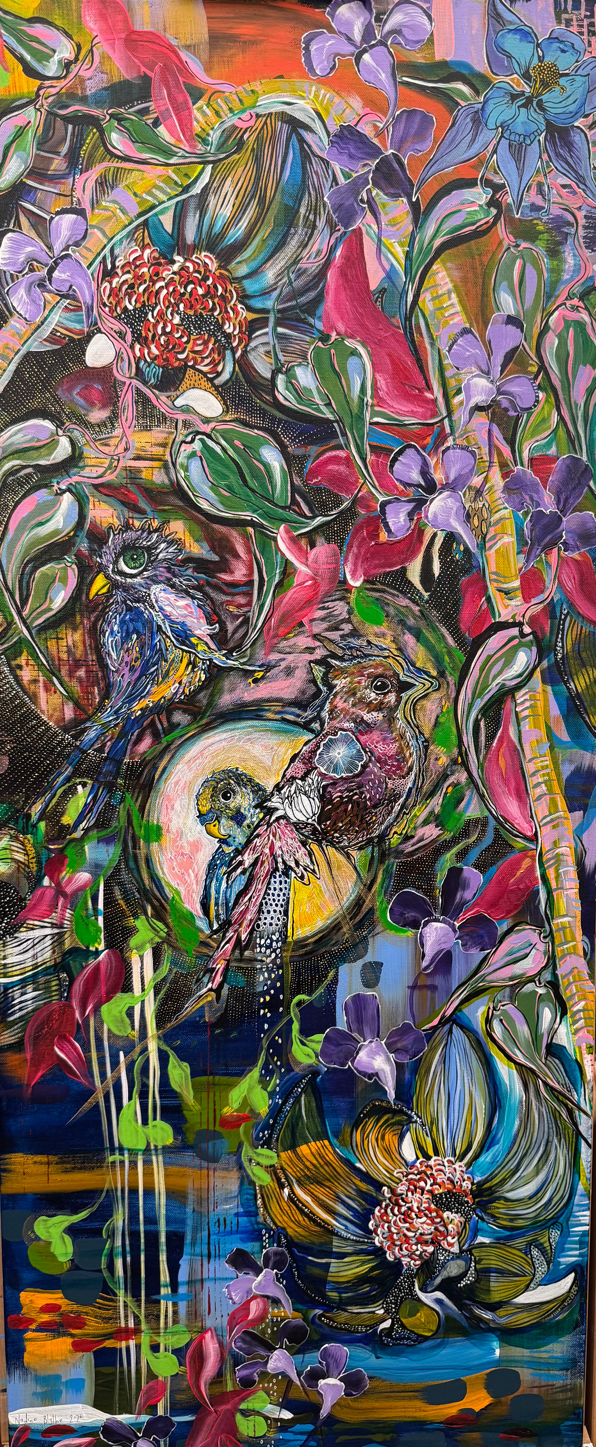 This enchanted realm is inspired by the vibrant flora and fauna of Australia, layered with texture, colour, and fine detail that reflect Nadine Blythe’s signature mixed-media style. The composition celebrates beauty in all its forms—from the delicate to the whimsical, from the perfectly imperfect to the joyfully peculiar.