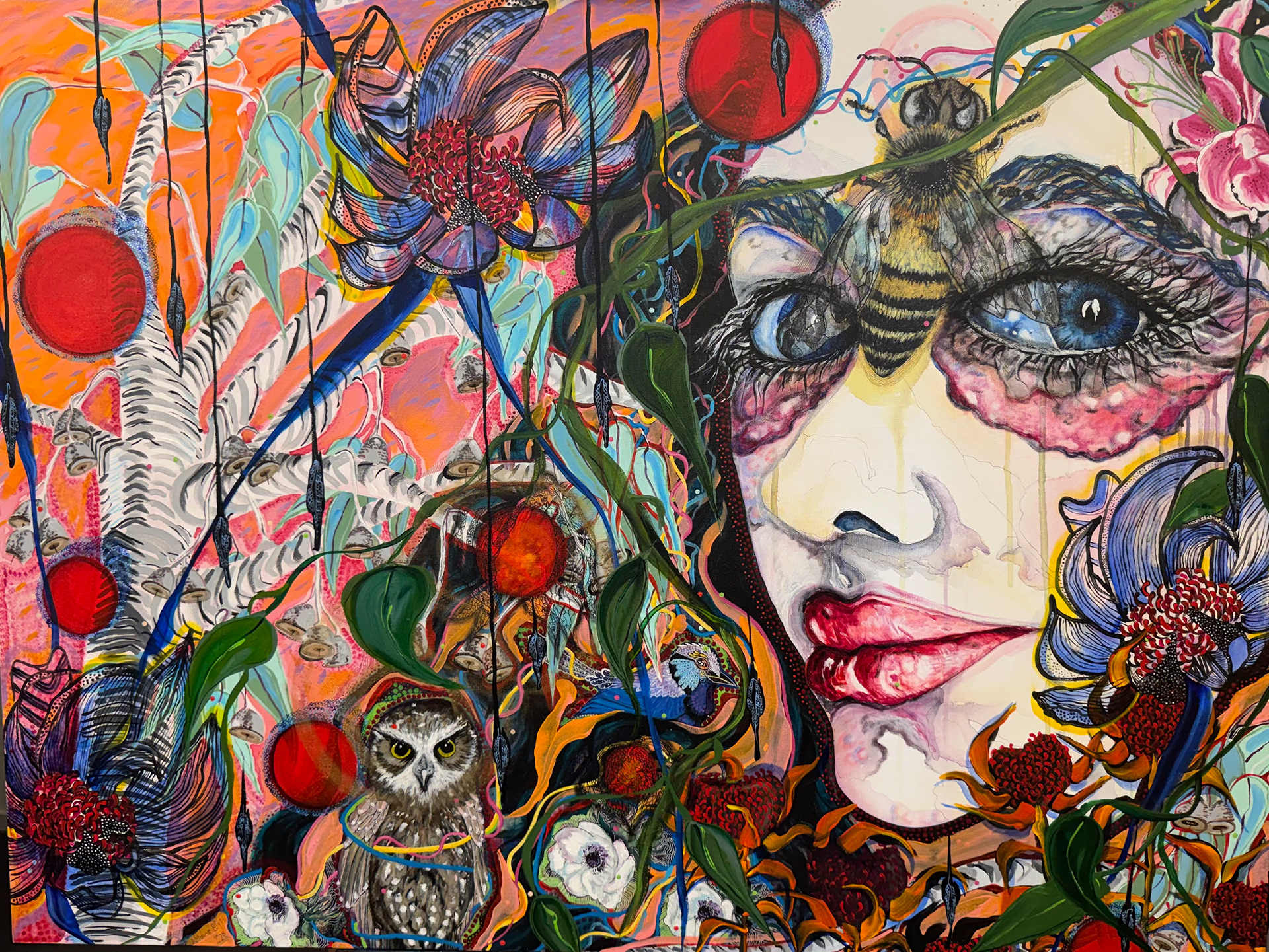 She commands the canvas with her size and facial expression yet there is something distinctly sensitive about her. She is strong and vulnerable, breakable, but she will not break. She engages directly with the viewer, the viewer is seen by her. The woman represents the complexities and wonder of the human condition and the impact place has on our being. She inhabits a world made up of Australian and American flora and fauna. Her hair is a tangle of Australian waratah flowers, two woodpeckers sit in her hair, they appear to add complexity to her world. She has topographical line work all over her face and body representing time passed and the mapping of place. She wears a large bee broach, it is over sized and represents the complex relationship between life force, natural beauty and threat.